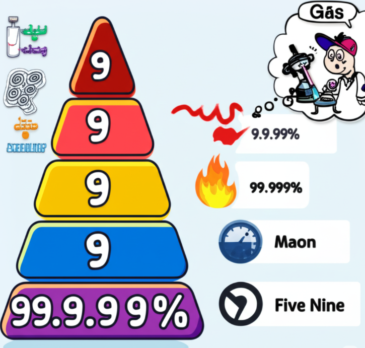 가스의 순도는 보통 'Nine'의 개수로 등급을 표현하는 경우가 많습니다. 예를 들어, 99.999% 순도는 소수점 아래 9가 다섯 개이므로 '파이브 나인(Five-Nine)'이라고 부릅니다.