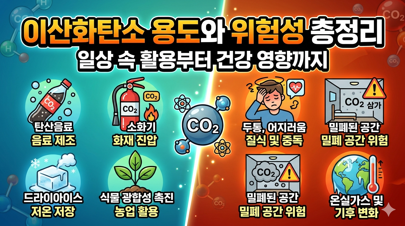 이산화탄소는 우리가 숨 쉬는 공기 속에 항상 존재하는 기체로, 일상생활과 산업 전반에서 다양하게 활용되고 있다. 하지만 농도가 높아질 경우 건강에 직접적인 영향을 줄 수 있어 올바른 이해가 필요하다. 이번 글에서는 이산화탄소의 주요 용도와 함께 반드시 알아야 할 위험성까지 체계적으로 정리해 본다.