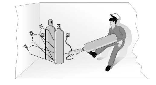 또한, 용기 내에 저장된 가스는 높은 에너지를 가지고 있으므로, 용기 전도로 인한 밸브 파손이 발생하게 되면, 위험한 상황을 초래할 수 있다. 따라서 용기를 사용하지 않는 경우에는, 반드시 밸브 보호용 캡을 설치하여 보관해야 하며, 사용 중의 용기는 반드시 전도를 방지하기 위하여 적절하게 묶여 있어야 한다.