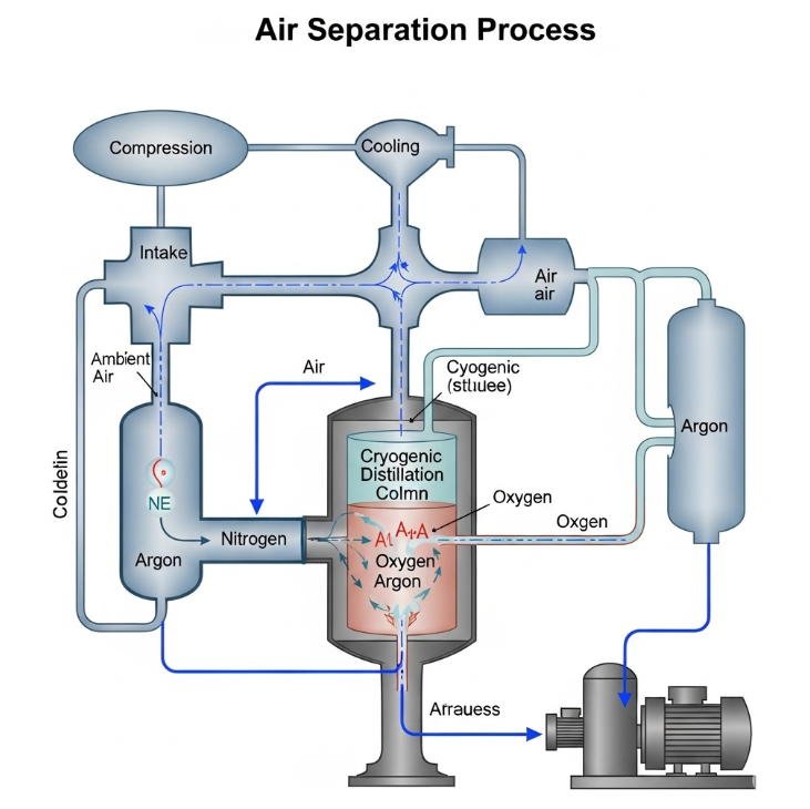 ASU(공기분리장치) 공정의 원리, 종류, 주요 단계 및 산업별 활용 분야를 총정리합니다. 초저온 증류를 통해 공기에서 순도 높은 산소, 질소, 아르곤을 분리하는 핵심 기술을 쉽고 명확하게 설명합니다.